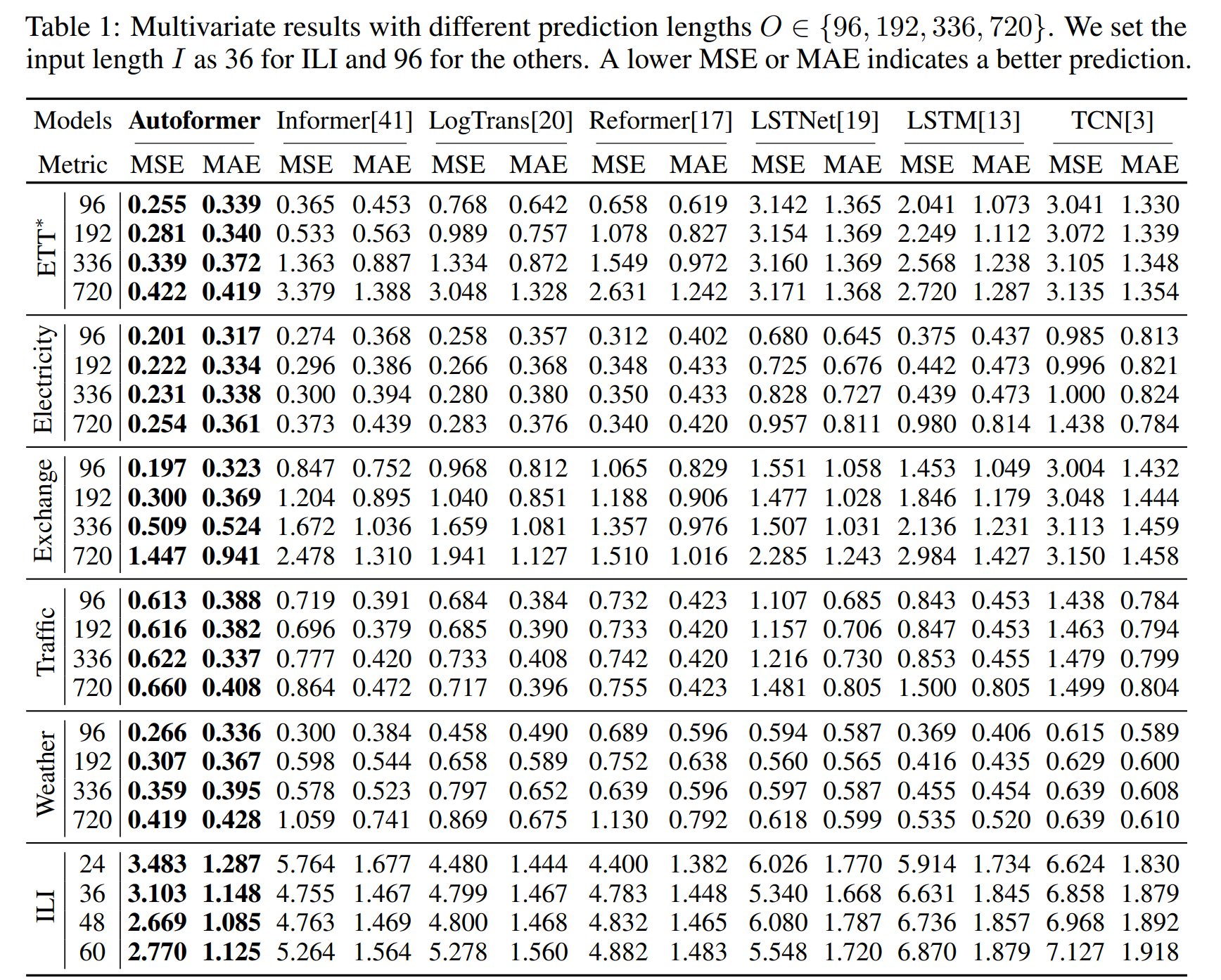 Autoformer 는 SOTA를 달성하였다. 전체적으로, 오토포머는 Exchange 데이터셋에서 특정한 주기가 없는데도 좋은 성능을 보였다. 오토포머의 퍼포먼스가 길이가 증가하더라도 일정한 것을 볼 수 있다. Autoformer가 롱텀에 더 로버스트 하다는 장점을 보인다.