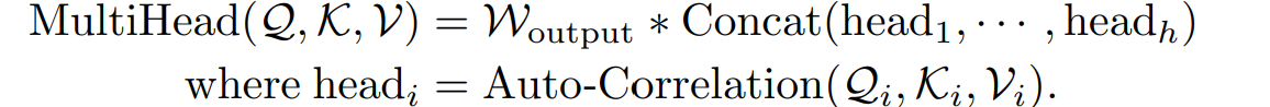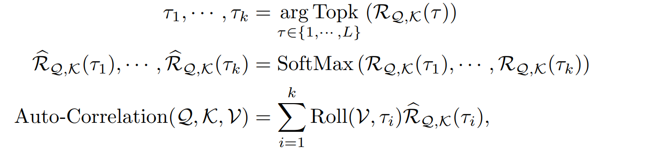 길이 L의 시계열 X 이 프로젝터를 통과하면 QKV를 얻게 된다. 이를 통해 self-attention을 대체할 수 있다. Autocorrelation 매커니즘은 다음과 같이 정리된다.