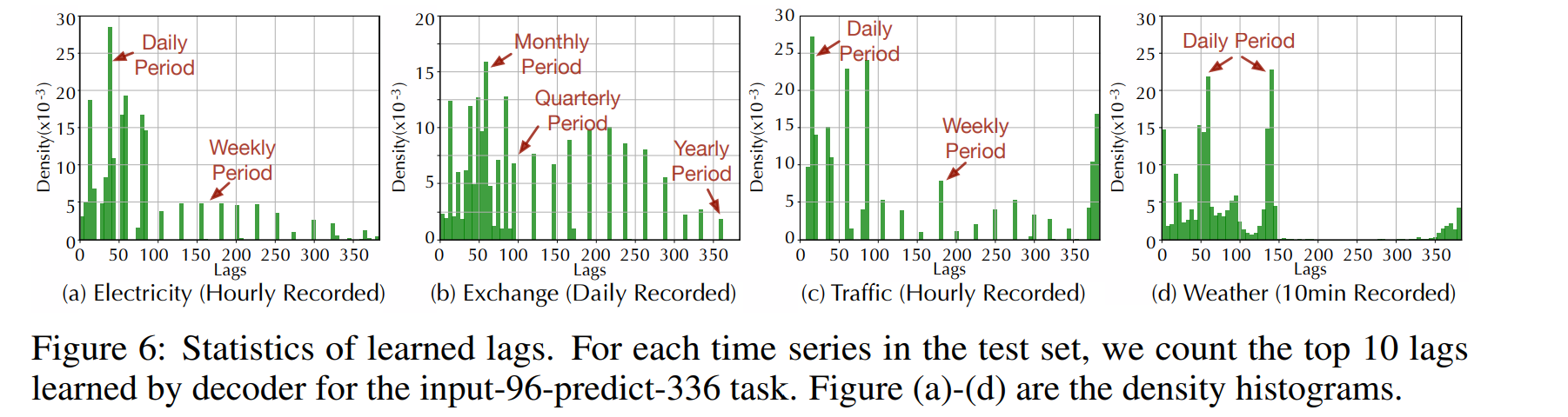 위 그림으로 Autoformer가 학습한 lags들은 실제 시즈널리티를 의미한다. Exchange 데이터의 데일리한 패턴, 한달, 분기, 년 주기의 패턴까지 포착하는 것을 알 수 있다.