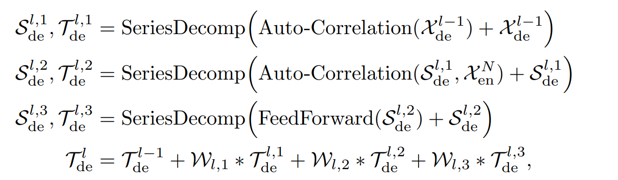 Fig.1 에서 encoder는 시즈널 파트 모델링에 집중한다. 인코더의 아웃풋은 이전 시즈널 정보를 디코더가 잘 이해하도록 정제하는 과정이다. N개의 인코더 레이어가 있을 때 전체적인 l번째 인코더 레이어를 타나내는 식은
