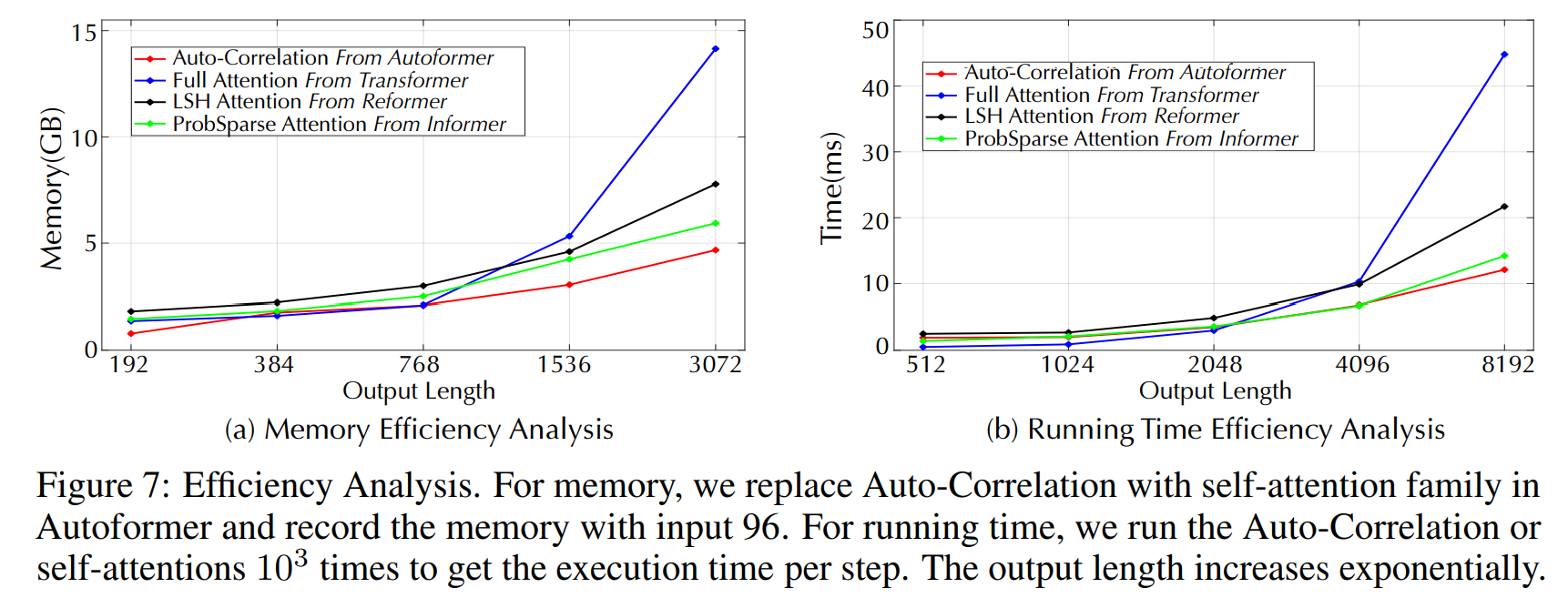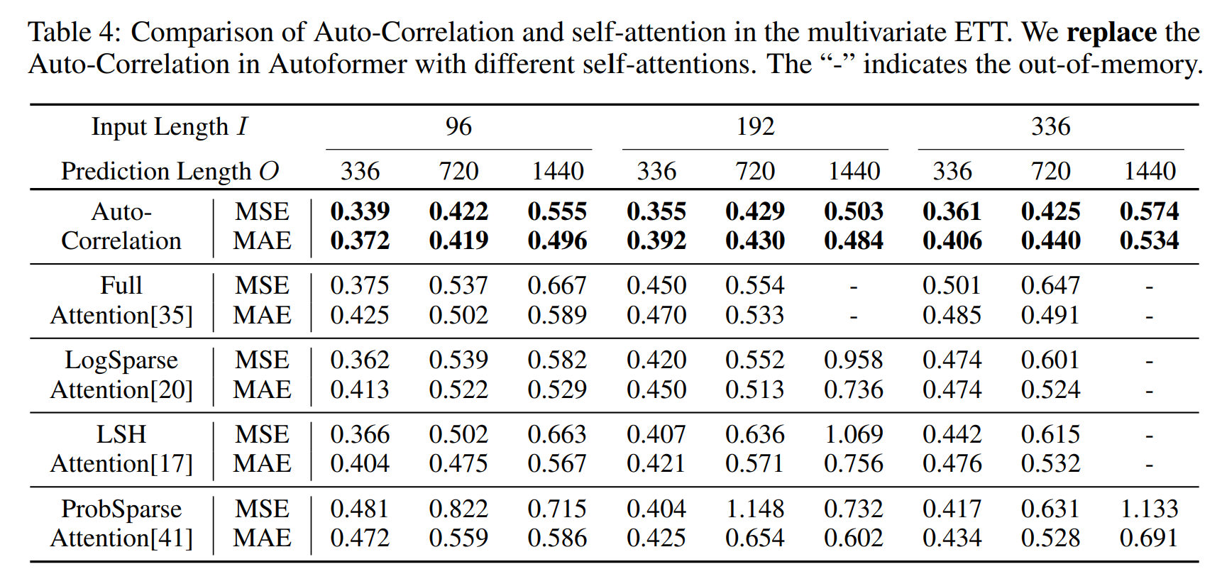 Auto-correlation이 가장 좋은 성능을 발휘하는 것을 알 수 있다. 특히 격차는 prediction lenght 가 길어질수록, 다른 것들은 아웃오브 메모리가 발생함에도 제안 방법론은 성능도 좋고 연산이 가능하였다.