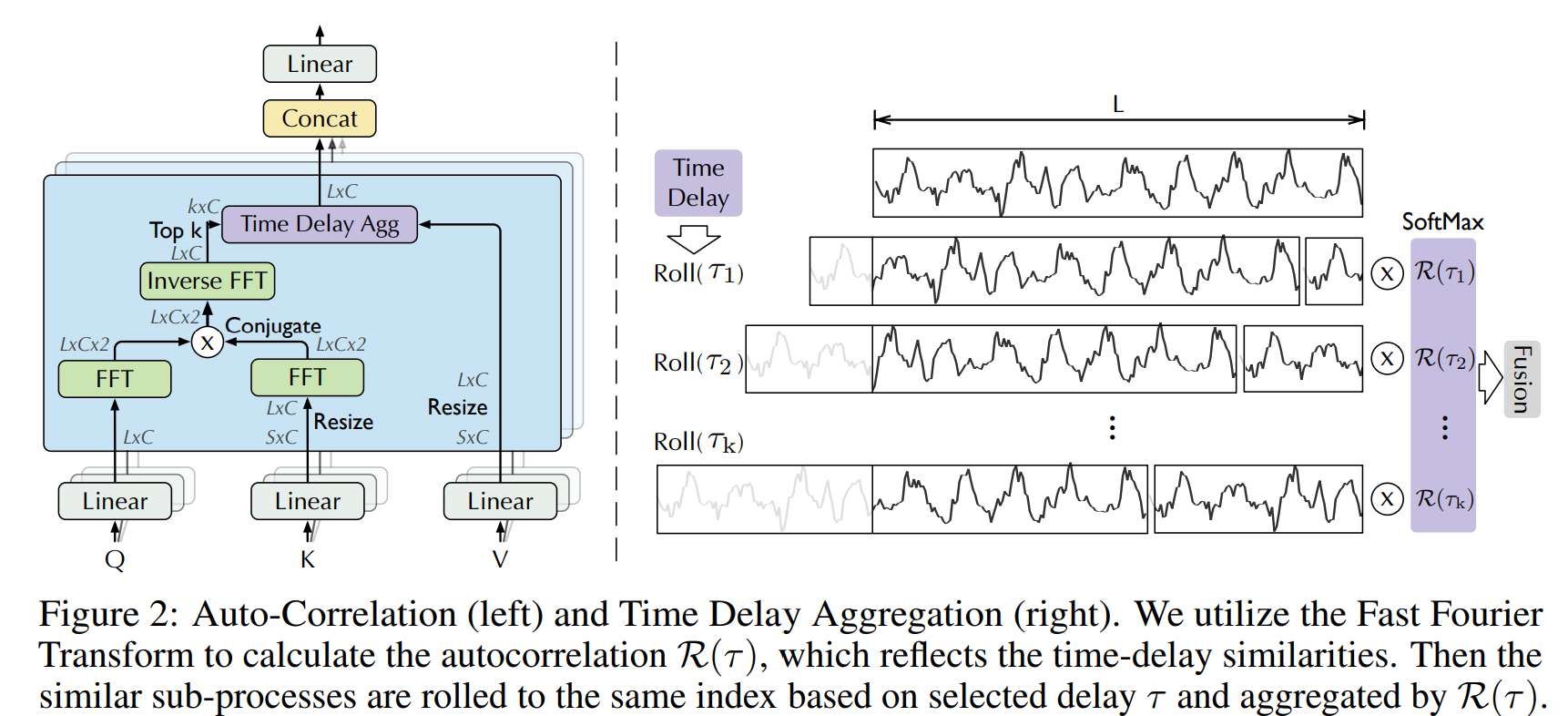 Auto-Correlation 는 주기 기반으로 의존성을 판별하는데 이는 autocorrelation을 통해 얻는다. 또한 비슷한 서브 시리즈들을 타임 딜레이 aggregation을 통해 획득한다.