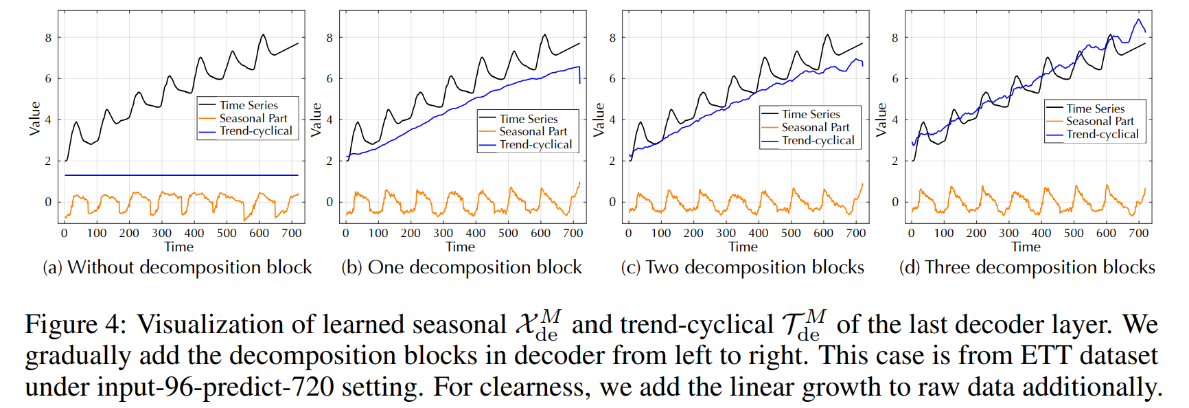 분해 블럭이 없으면 시즈널한 것을 따라가지 못한다. 또한 series decomposition 블럭을 추가함으로써 더 trend를 잘 예측하는 것을 알 수 있다. 이는 progressive한 decomposition 아키텍처를 설꼐해야하는 이유에 대해 잘 알려준다.