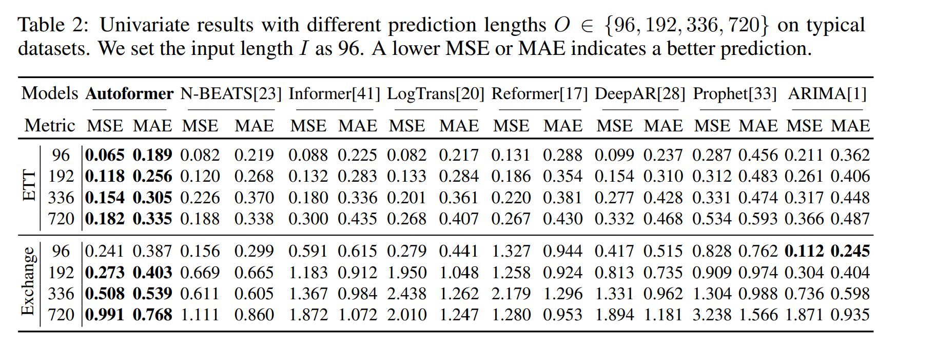 오토포머가 SOTA를 달성하였다. ARIMA가 Exchange의 96에 대해서는 성능이 좋으나, 이는 일시적인 변동에 더 잘 집중하는 알고리즘 상 성능이 조금 더 좋게 나온 것이며, 더 롱텀으로 갈 시에는 제안 방법론이 더 잘 예측하였다.