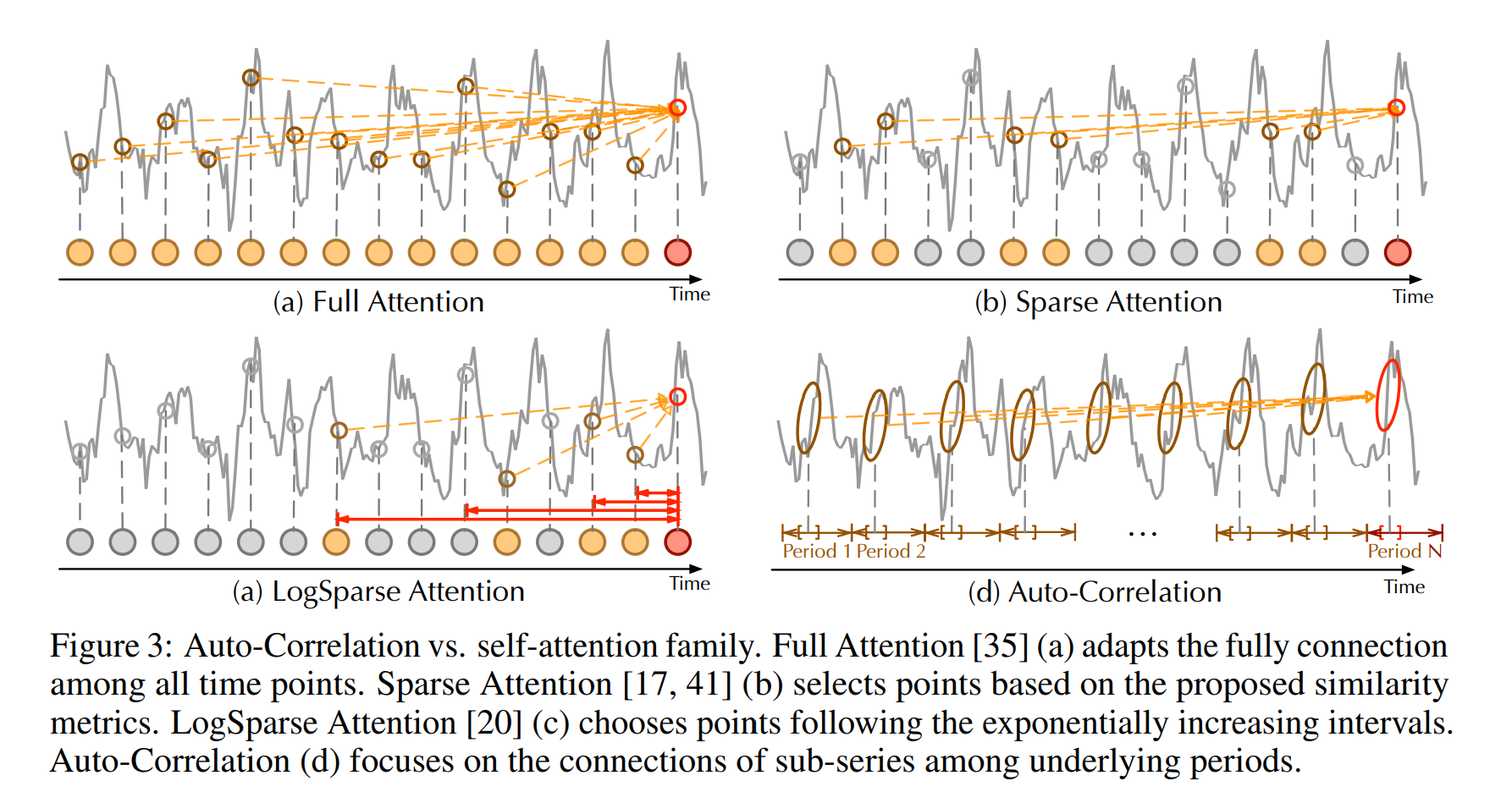 auto-coreelation은 series wise connection을 수행한다. 구체적으로 temporal 의존성을 보려고 할 떄 서브 시리즈들 간의 의존성을 주기르 기반으로 보게 된다. 대조적으로, self-attention 은 단지 분산된 포인트들끼리의 관계를 보게 된다. 몇몇 self-attention 방법론은 로컬 정보를 보기는 하지만, 단지 point wise 를 돕기 위한 정보로 활용한다. 본 연구에서는 정보 aggregation을 하기 위해서 타임딜레이 블록을 사용했고, 비슷한 서브 시리즈들을 사용한다. inherent sparsity와 서브 시리즈 레벨의 표현 aggregation을 하기 위해 Auto-correlation 은 동시에 계산 효율과 정보 사용에 효과적이다.