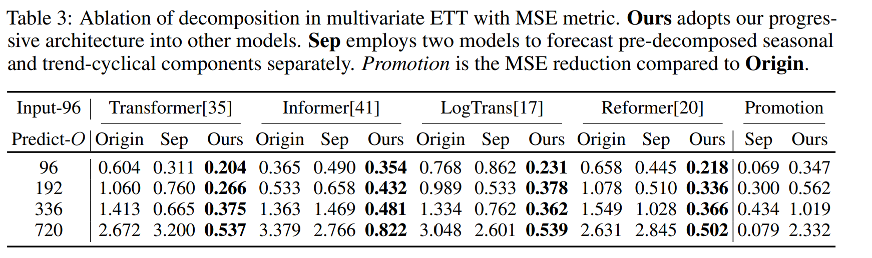 Ours는 각 모델에서 분해 모듈을 적용한 방법론이다. 다른 모델들에서 내부 구조에서 분해 모듈을 적용하였을 때 지속적인 promotion을 받을 수 있었다. 특히 O 길이가 증가할 수록 이 promotion이 증가하였다. 이를 통해 제안 방법론이 복잡한 패턴으로부터 시계열을 특징을 효과적으로 추출하고, 더 큰 모델에 쓸수록 더 좋은 성능을 보임을 알 수 있다.