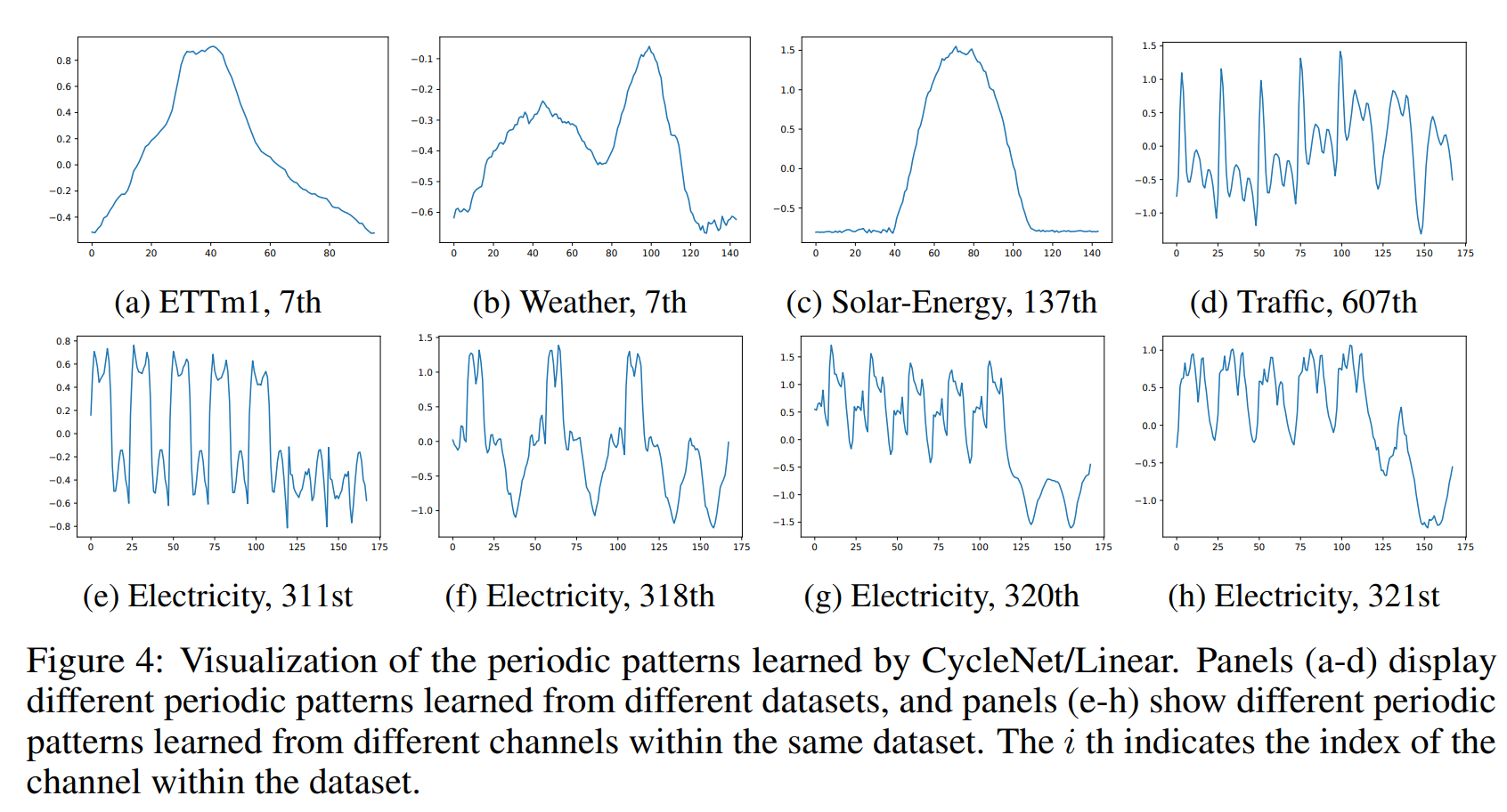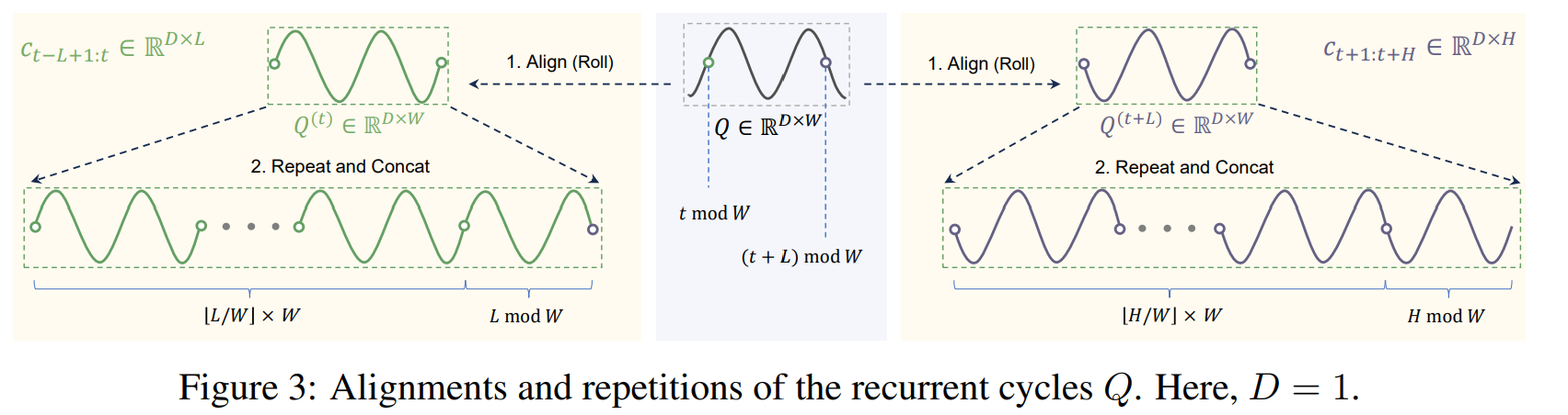 RCF 테크닉의 목적은 learnable recurrent cycles Q 를 모델하는 것이다. Fig 4. 는 다른 주기 패턴이 다른 데이터셋과 채널에서 얻어지는 것을 나타낸다.