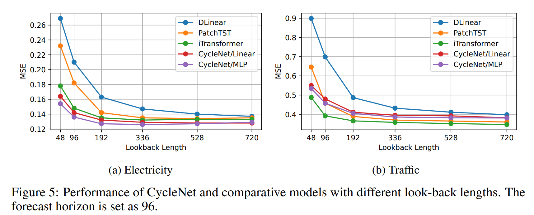 그러나 Traffic 에서는 아까 설명했다시피 iTransformer가 성능이 더 좋았다. 따라서 백본 모델에서 CycleNet을 활용할 때 이러한 변수간 공간-시간 관계가 중요한 데이터셋에 대해서는 다양한 시도가 필요하다.