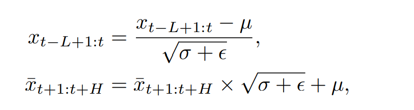시계열 데이터는 평균과 분산이 바뀌는 경우가 있다. 이는 분포 변화를 의미하며, 모델이 이전 학습 데이터에서 미래 데이터를 예측하는데 퍼포먼스를 낮추는 원인이 된다. 따라서 이러한 이슈를 다루기 위해서 Insatance Normalization RevIN 과 같은 연구들이 있었는데, 이와 비슷하게 CycleNet 모델 내부에서 변하는 통계 특성을 다루지 않게 다음과 같이 사용하여 처리한다.