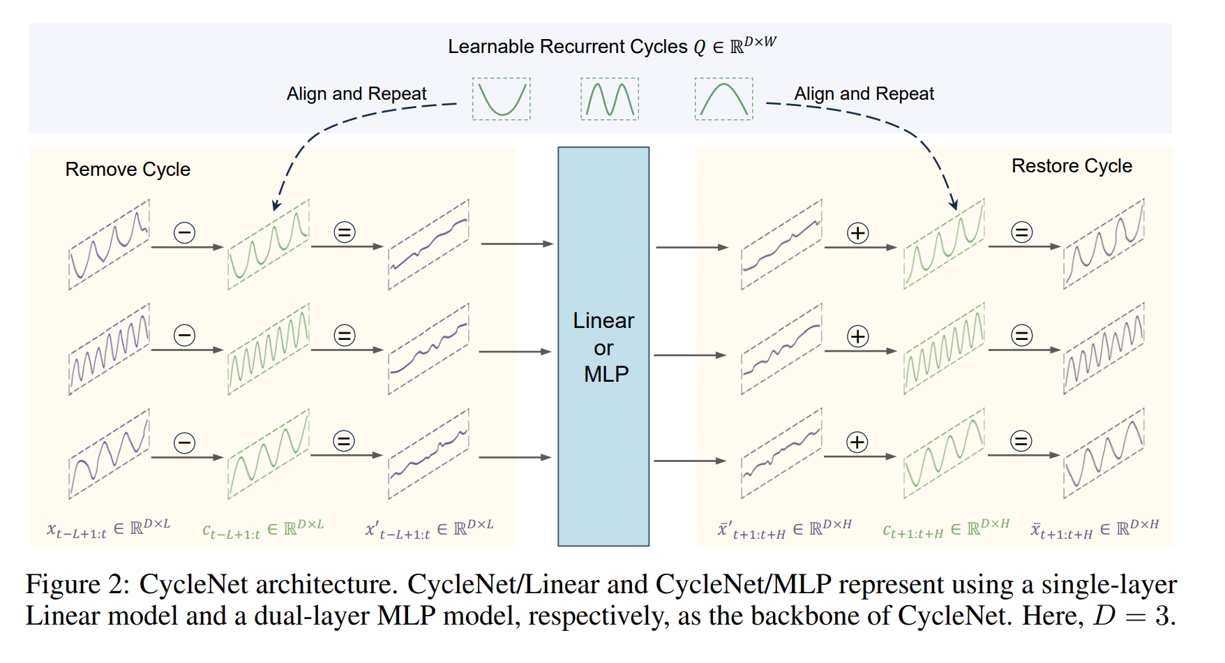 본 연구에서는 주기성을 이용하여 LTSF 태스크에서 좋은 성능을 보이는것을 목표로 한다. 구체적으로 Residual Cycle Forecasting (RCF)라는 학습가능한 recurrent cycles를 활용해서 내제적 주기 패턴을 모델링하고, 사이클의 남은 컴포넌트에 대해 예측을 수행한다. RCF을 리니어 레이어 MLP를 혼합함으로써 파워풀한 성능을 보인다. CycleNet은 SOTA 성능을 달성하였고, 90%의 파라미터 양을 줄였다. 게다가 플러그 앤 플레이 테크닉을 통해서 RCF는 기존 모델의 PatchTST 와 iTransformer의 예측 정확도를 향상시켰다.