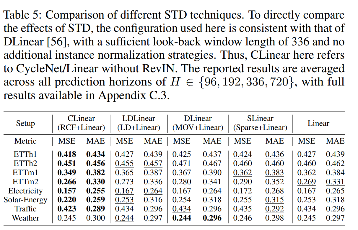 RCF는 다른 STD 방법론 대비 좋은 성능을 보인다. 특히 강한 주기성을 갖는 Electricity와 solar energy에서 특히 성능이 좋다. 이는 MOV와 LD 기반의 STD 방법론들은 trend 예측을 룩백 윈도우의 슬라이딩 aggregation을 통해서 수행하는데, 내제된 이슈가 있다. 슬라이딩 윈도우를 무빙 에버리지 취하는 방법을 하자면, 맥시멈 시즈널 컴포넌트의 주기보다 더 슬라이딩 윈도우의 길이가 커야 하낟. 그렇지 않으면, 분해를 하는 것이 불안정하게 된다.