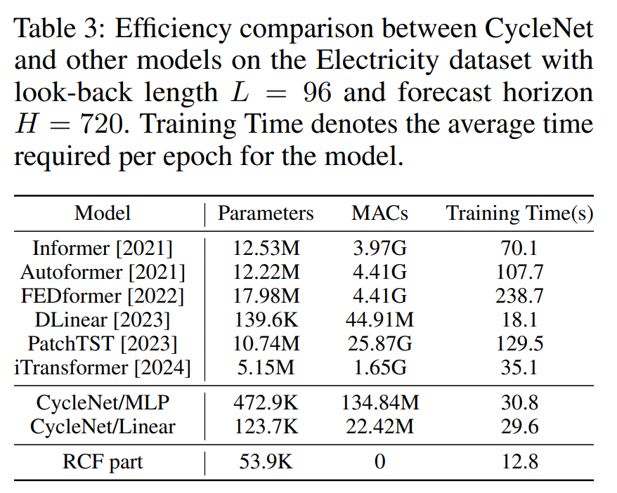 Operations (MACs)을 추가하지 않는다. 사이클넷의 백본은 MLP 혹은 Linear 이므로, 아주 낮은 복잡도를 가지낟. RCF 는 단지 DLinear 보다 학습 시간이 더 걸린다. 이는 RCF 테크닉은 각 데이터 샘플의 recurrent 사이클들에 대해 정렬하는 과정이 필요하기 때문에 CPU 타임을 필요로 한다. 하지만, 퍼모먼스와 효율의 최고의 밸런스를 보여준다.