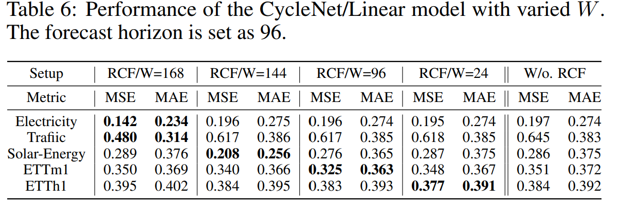 RCF의 효과를 보기 위해 Electricity와 Traffic에 대해 ablation 을 수행하였다.