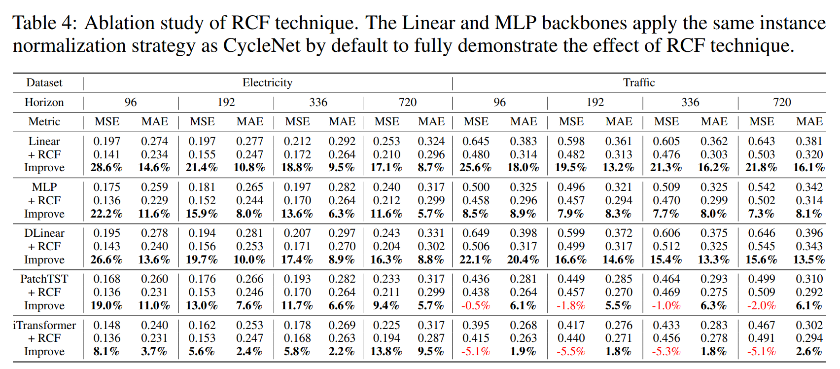 기본적인 Linear와 MLP에서 CycleNet을 추가하였을 때 아주 좋은 성능을 보였다. 또한 RCF를 다른 모델에 PatchTST, iTransformer 추가하였을 때에도 마찬가지로 20%에 가까운 성능 향상을 보였다.
