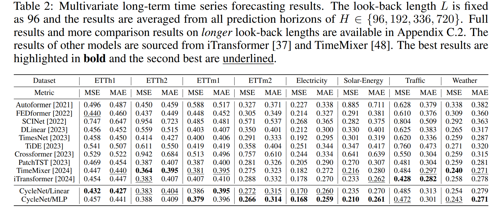 CycleNet/MLP 는 다변량 LSTF 태스크에서 SOTA 성능을 나타내었다. RCF 테크닉을 추가함으로써 기본적인 MLP와 Linear 모델도 SOTA를 달성할 수 있었다.