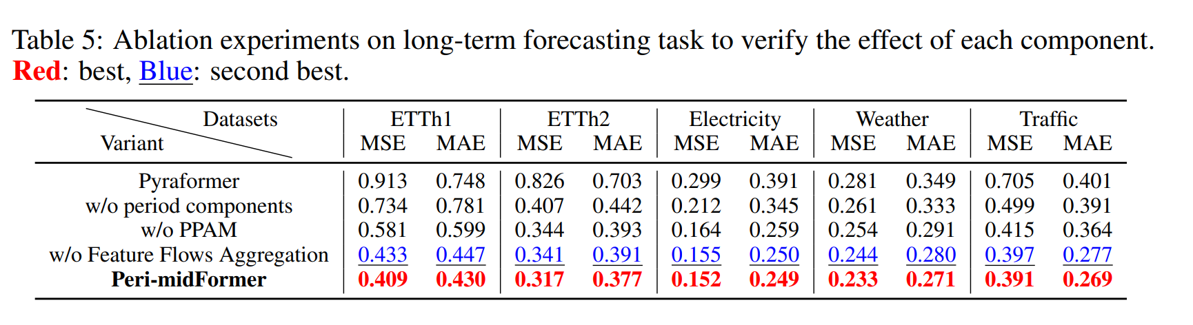 각 추가 모듈에 대한 실험을 통해 Peri-midFormer가 좋은 성능을 보임을 알 수 있다. 심지어 PPAM 없이도 좋은 결과를 보임을 알 수 있다. 이는 시계열에 내제된 주기적 성질을 추출하는 기본 적 특성 때문이다. 그러나 PPAM 으로 포함 관계를 강조하지 않은 경우에, 주기적 full 어탠션의 능력이 제한되어 성능이 떨어지게 된다.