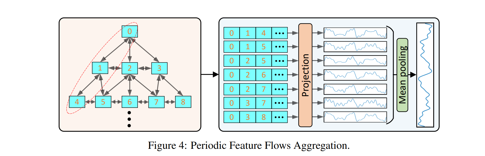e Periodic Feature Flows Aggregation은 재구성 태스크에서 사용된다고 언급하였었다. Peri-midFormer의 아웃풋은 피라미드 구조를 유지한다. 이러한 다양한 주기 컴포넌트간 정보를 활용하기 위해서, 하나의 가지를 탑에서 바텀으로 periodic feature flow로 이름짓는다. 이는 Fig 4. 에서 나타난다.