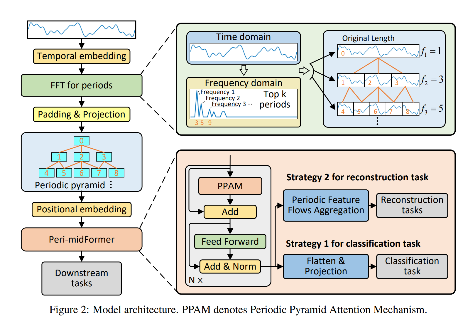Fig.1은 periodic inclusion 관계에 대해서 표현하는데, 각 레벨은 같은 주기의 컴퍼넌트로 구성되어 있으며, 다른 레벨은 포함 관계를 의미한다. 이러한 변환은 original 1D 시계열을 2D representation으로 나타냄으로써, 다양한 주기의 관계를 표현하게 된다. 이 피라미드에서, 하나의 주기 컴포넌트는 2개의 상위 주기 컴포넌트에 포함될 수 있다. Peri-midFormer는 self-attention으로 이루어져 있다. 또한, peridoic pyramid의 각 가지는 periodic feature flow로 고려하고 특질을 모아 다운스트림 태스크에 더 양질의 정보를 제공한다. 실험을 통해 SOTA 퍼포먼스를 보였다.