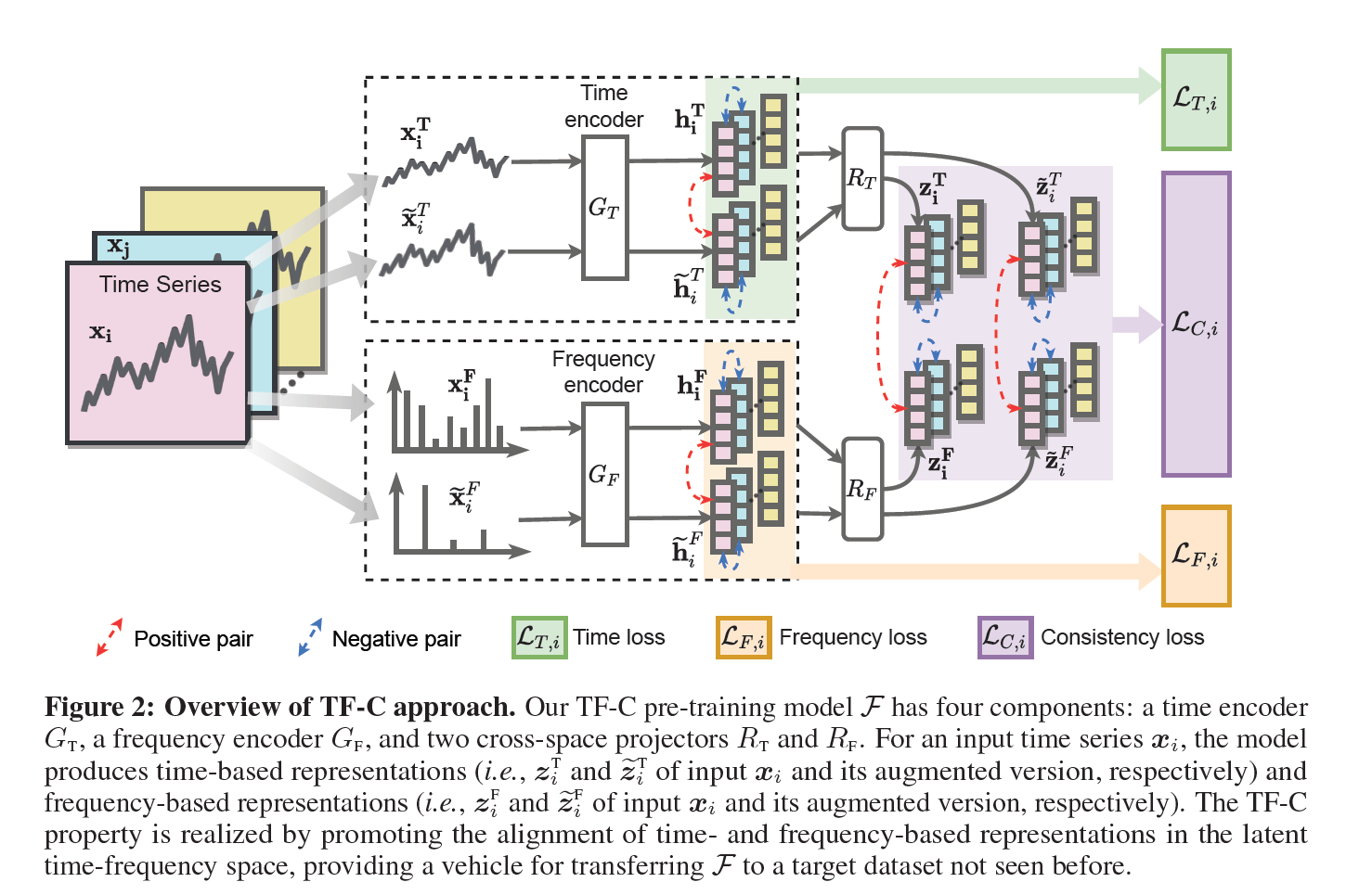TF-C 모델링 기반으로 시간 기반 및 주파수 표현을 특정하는 것으로, 표현간의 거리가 가깝다. 특별히, 시간 도메인에서는 contrastive learning을 통해 time-based representation을 만든다. frequency spectrum의 특성을 이용하여 주파수도메인에서는 augmentation을 진행하는데, contrastive instance discrimination을 통해 embedding을 진행한다. 이것의 첫 번째는 주파수 기반의 대조 augmentation 을 develop하여 spectral 정보를 사용하고 타임도메인에서의 시간-주파수 consistency를 찾게 된다. pre-training 목적은 time-based 와 frequency based의 embeddings의 거리를 줄이는 것이다. 이는 novel consistency loss를 통해 가능하다. self-supervised loss는 pre-training model을 최적화 하는데 사용되고, latent space의 시간 - 주파수 도메인의 consistency를 강화하는데 사용된다. 이렇게 학습된 관계는 모델 파라미터들에 인코드되어 fine-tuning 모델을 시작하는데 사용되며 새로운 데이터셋이 들어왔을 때 성능을 높이게 된다.