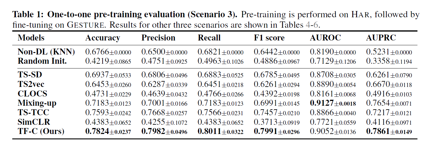 우리는 TF-C 모델을 8개의 시계열 데이터셋에 2가지 평가 세팅에 적용하였다. 결과는 TF-C의 전이가 긍정적이었으며, 모든 베이스라인 모델들모다 F1 스코어에서 마진이 높은 것으로 나타났다. TF-C 접근 방식이 이전의 방법보다 8.4% 정확도가 높아 하나의 pre-trained model로 많은 fine-tuning dataset을 적용하는데에 이전 연구보다 성능이 좋음을 보였다.