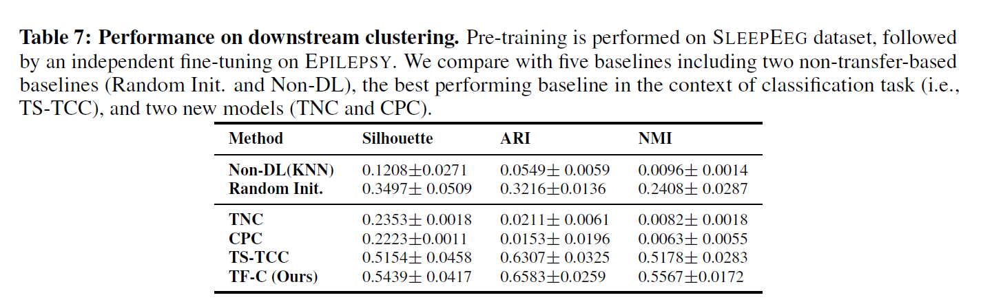 best clustering sbaseline(TS-TCC)를 앞섬을 보여준다. TF-C가 더 distinctive representations를 pre-training 에서 좀 더 가져옴을 알 수 있다.
