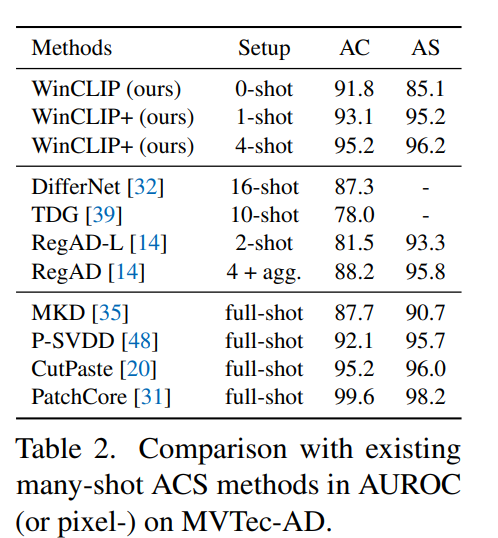우리의 4-shot WinCLIP+는 모델 튜닝을 위해 풀샷 샘플을 사용하는 최근 방법과 경쟁할 수 있다. CutPaste 와 비교하여 경쟁력이 있으며, WinCLIP은 최근 몇 샷 학습 방법들인 DifferNet과 TDG를 능가한다. 이들의 10샷 이상보다 제안한 방법론의 성능이 좋았다.
