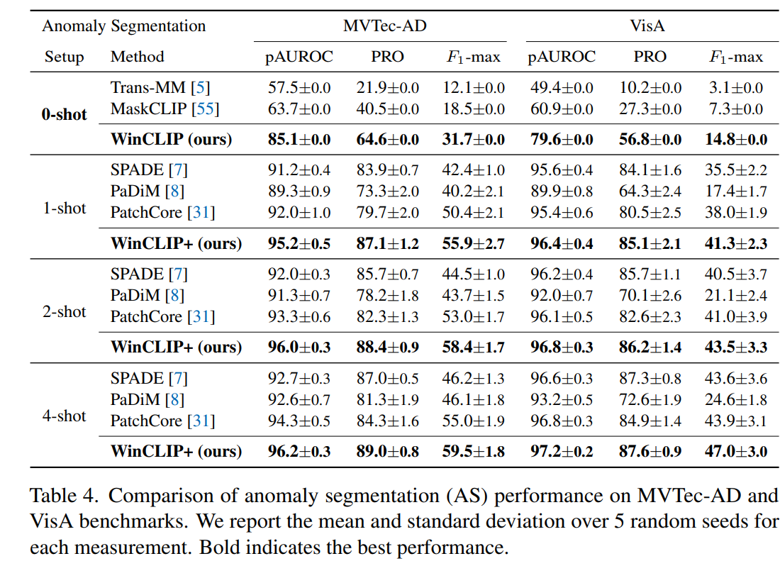 제로샷 이상 분할에 대한 이전 연구는 따로 존재하지는 않지만, 두 가지 방법을 변형하여 사용하면 다음과 같다. 1. Trans-MM은 트랜스포머 모델을 위한 최근 모델 해석 방법으로 픽셀 수준의 마스크를 제공한다. 2. MaskCLIP은 MVTec-AD와 VisA 데이터셋 모두에서 두 방법을 크게 능가 한다. 이는 CLIP의 일반적인 변형이 WinCLIP만큼 성능을 발휘하지 못하기 때문이다.