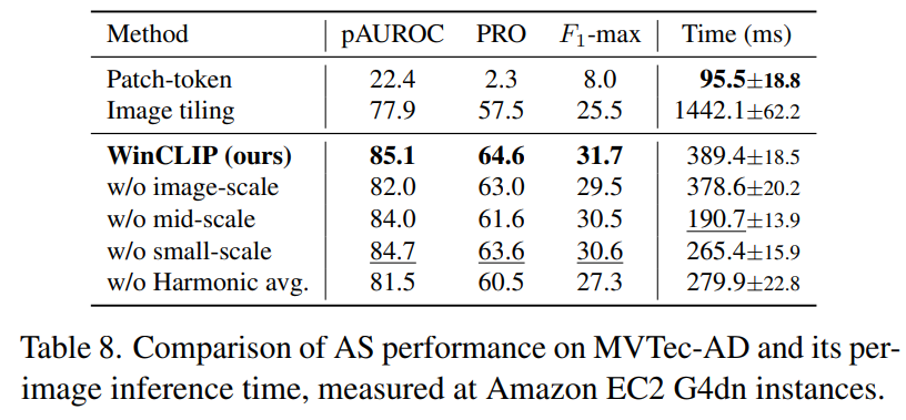 WinCLIP for AS: Table8. 을 통해서 WinCLIP이 제로샷 이상 분할을 위해 로컬 특징을 추출하는 효율 뿐 아니라, 결과를 향상시키기 위한 다중 스케일과 조화 평균의 효과를 검증한다. 패치 토큰은 빠른 추론 시간을 가지지만 언어와 정렬되지 않는다. 이미지 타일링은 로컬 특징을 활용할 수 있지만, 상당한 계산 오버헤드를 발생시킨다. WinCLIP은 로컬 특징을 윈도우 기반으로ㅓ 계산하여 더 나은 성능을 보이면서도 추론 속도를 가속화 한다. 이미지 수준의 특징과 중간/로컬 컨텍스트 모두에서 분할 성능이 향상된다.