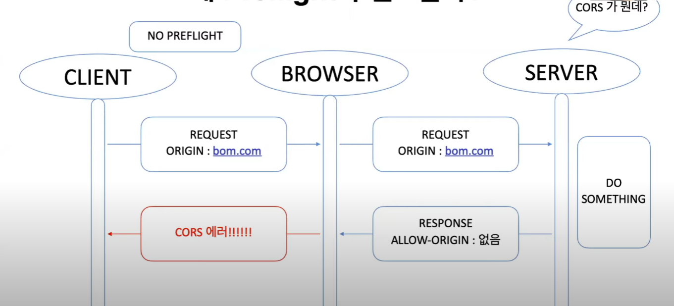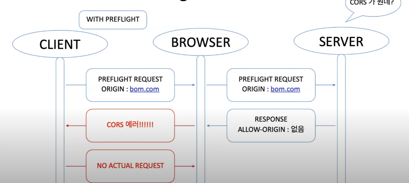 만약 Preflight Request(사전 요청)이 있을 경우에는 클라이언트가 브러우저에게 Preflight Request을 보내고 브러우저는 그 요청을 서버에게 전달한다. 서버의 입장에서는 CORS의 설정이 없는 상태이기에 Access-Control-Allow-Origin이 없는 상태가 되고 브라우저는 클라이언트에게 CORS Error를 보여주게 된다. 그 후 CORS Error을 통해 클라이언트는 Actual Request(실제 요청)을 보내지 않게 되는 것이다.