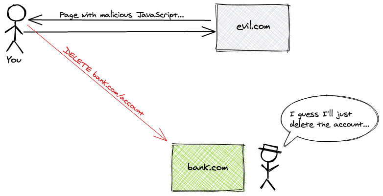 홈페이지를 서핑하고 있는데, <script>가 심어진 evil.com 페이지를 열었다고 생각해봅시다. 굉장히 유용한 정보를 담고 있는 사이트이지만, 페이지를 열면서 <script>가 실행되어 은행에 'Delete /account'를 요청하도록 되어 있습니다. AJAX 호출로 은행 API를 호출하여 나의 은행 계좌를 삭제해버리는 사고가 발생합니다.