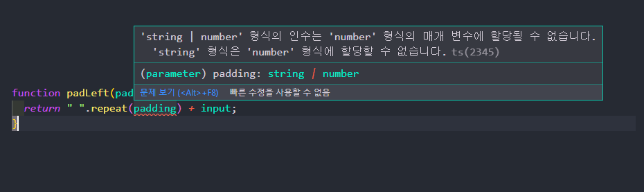 repeat()메서드는 문자열을 주어진 횟수만큼 반복해 붙인 새로운 문자열을 반환합니다. 하지만 padLeft함수의 padding매개변수는 타입이 number 또는 string이기 때문에 아래와 같은 에러가 발생한다.