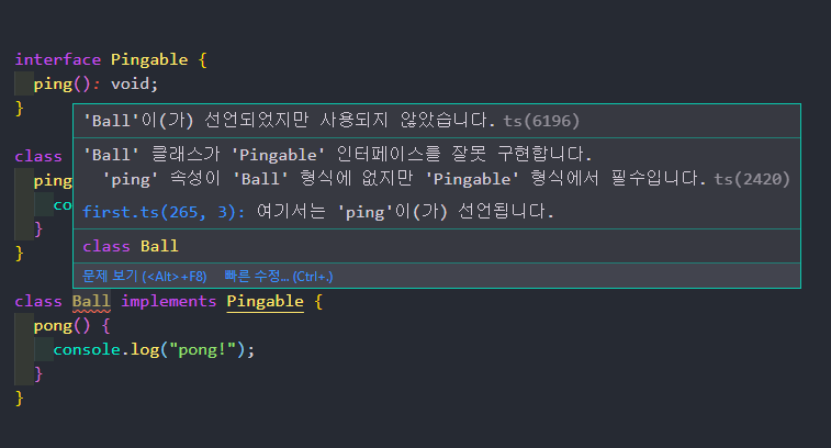implements를 사용하여 특정 클래스가 interface에 총족하는지 확인할 수 있다. 클래스를 올바르게 구현하지 못했다면 오류를 발생시킨다.