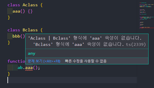 const c: C = ab // error:' age' 속성이 'A' 형식에 없지만 'C' 형식에서 필수입니다
