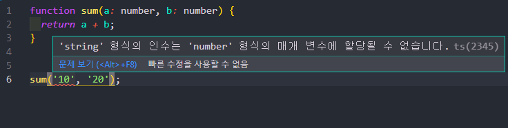 sum('10', '20'); // Error: '10'은 number에 할당될 수 없습니다.
