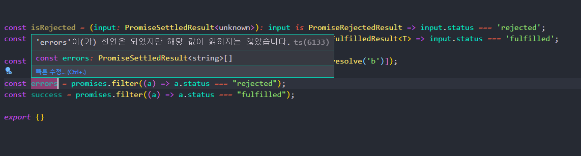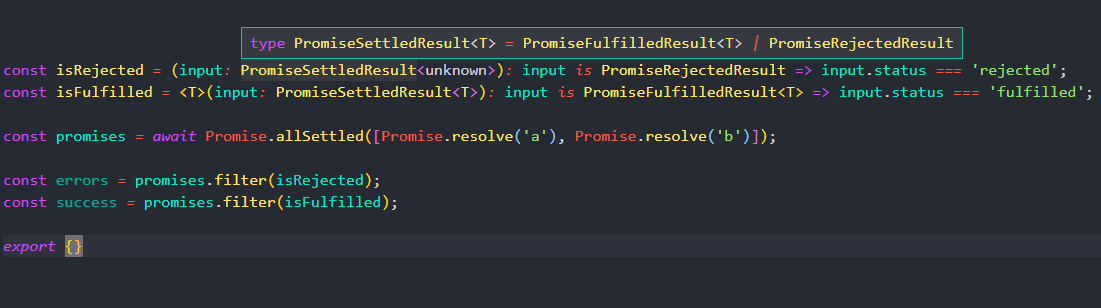 const isRejected = (input: PromiseSettledResult<unknown>): input is PromiseRejectedResult => {