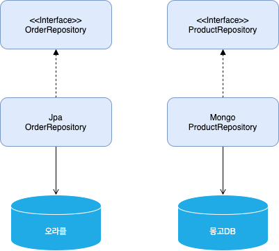 애그리거트마다 서로 다른 저장소를 사용하면 한 번의 쿼리로 관련 애그리거트를 조회할 수 없다.