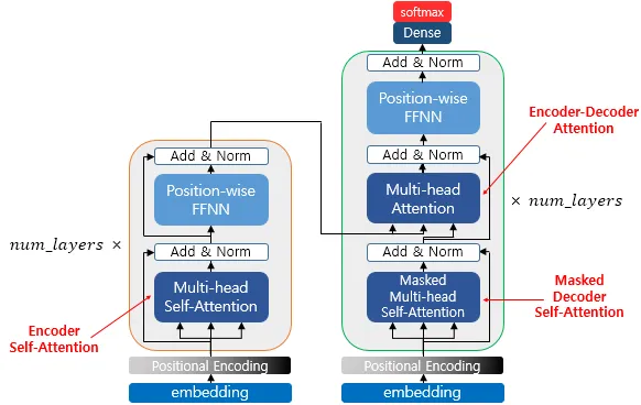 3. encoder-decoder attention : ์ธ์ฝ๋ ๋ฒกํฐ๋ฅผ ์ธํ์ผ๋ก ๋ฐ๋ ์ดํ ์