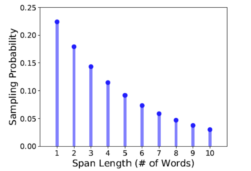 - 기하 분포(Geo(p=0.2))에서 스팬 길이를 샘플링하여 짧은 스팬이 더 자주 선택된다.