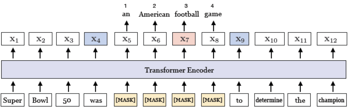 트랜스포머 인코더의 출력을 x_1,x_2,...,x_n 이라 할 때, 마스킹된 span(x_s, ..., x_e)의 내부 토큰 x_i를 다음과 같이 표현한다.