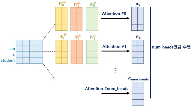 ๊ฐ๊ฐ์ attention value matrix๋ฅผ attention head๋ผ๊ณ ๋ถ๋ฅธ๋ค.