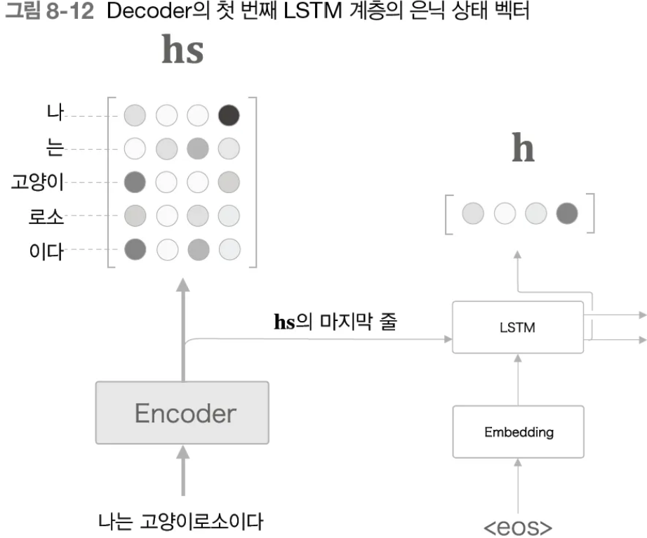 ( โป ์ด๋ 1๋ฒ์งธ ์์ ์ ๊ฒฝ์ฐ, ์ด์ LSTM ์ ์ด ์์ผ๋ฏ๋ก, Encoder์ ์๋ ์ํ ๋ฒกํฐ๋ฅผ ํฉ์น ํ๋ ฌ์ธhs๋ฅผ input )