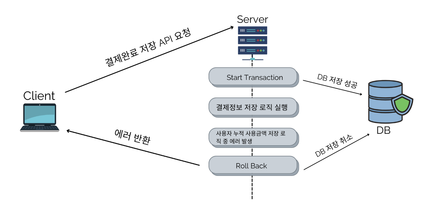 프론트엔드(클라이언트)에서 결제 완료 저장 API가 요청되면 백엔드(Server)에서는 트랜잭션을 시작하여 결제 정보 저장 로직을 실행한다. API가 진행되는 와중에 에러가 발생되지 않았다면 commit 성공을 확정시켜준다. 이 순간 트랜잭션에 저장된 작업들은 수행되게 된다. 만약 에러가 발생되었다면 rollback으로 진행된 트랜잭션 작업들을 원상복구시킨다.