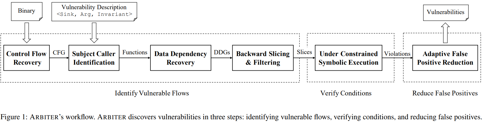 저자는 바이너리 코드 분석에서 몇가지 발전을 만들며 기술을 구현했고, arbiter라는 프로토타입을 만들었다. 저자는 네가지 common vulnerability classes에서 큰 스케일의 평가로 저자의 접근방식의 효과성을 증명한다: CWE-131(버퍼 사이즈의 부정확한 계산), CWE-252(check되지 않은 반환 값), CWE-134(uncontrol된 포맷 스트링), CWE-337(난수 생성기의 예상가능한 seed). 저자는 우분투 저장소의 76516개 이상의 x86-64 바이너리들에서 이 접근방식을 평가했고, 컴파일 과정에서 프로그램에 삽입되는 결함을 포함하여 새로운 취약점을 발견했다.