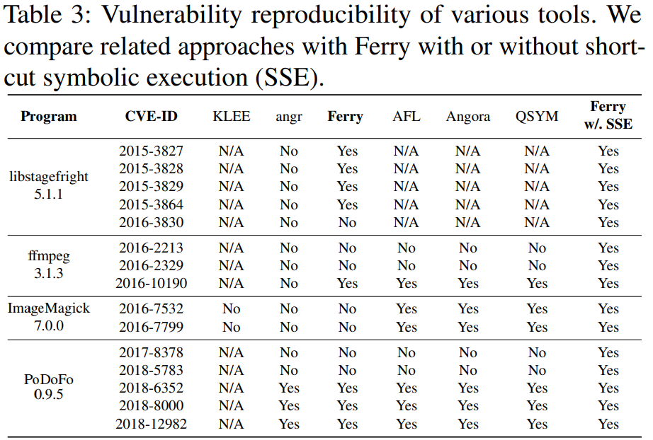 이 도구들의 성공적인 분석 중에서도, Ferry는 shortcut 심볼릭 실행을 활성화시키지 않고도, 15개의 취약점 중 8개를 재현할 수 있다. shortcut 심볼릭 실행이 활성화된 후, Ferry는 모든 취약점을 찾을 수 있다.