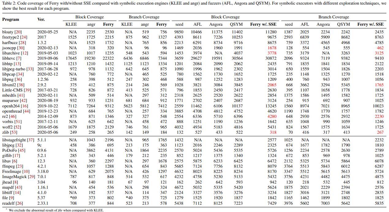 또한, Ferry의 효율성을 더욱 개선하기 위해, 여러가지 최적화 기법을 제안한다. 우리는 Ferry를 널리 사용되는 Symbolic Execution 엔진인 angr와 KLEE, 그리고 인기있는 퍼저인 AFL, Angora, QSYM과 비교하여 13개의 실제 프로그램에 대해 실험을 수행한다. 이 프로그램은 표 1에 나열된 7개 프로그램과 Google FuzzBench를 포함한다.