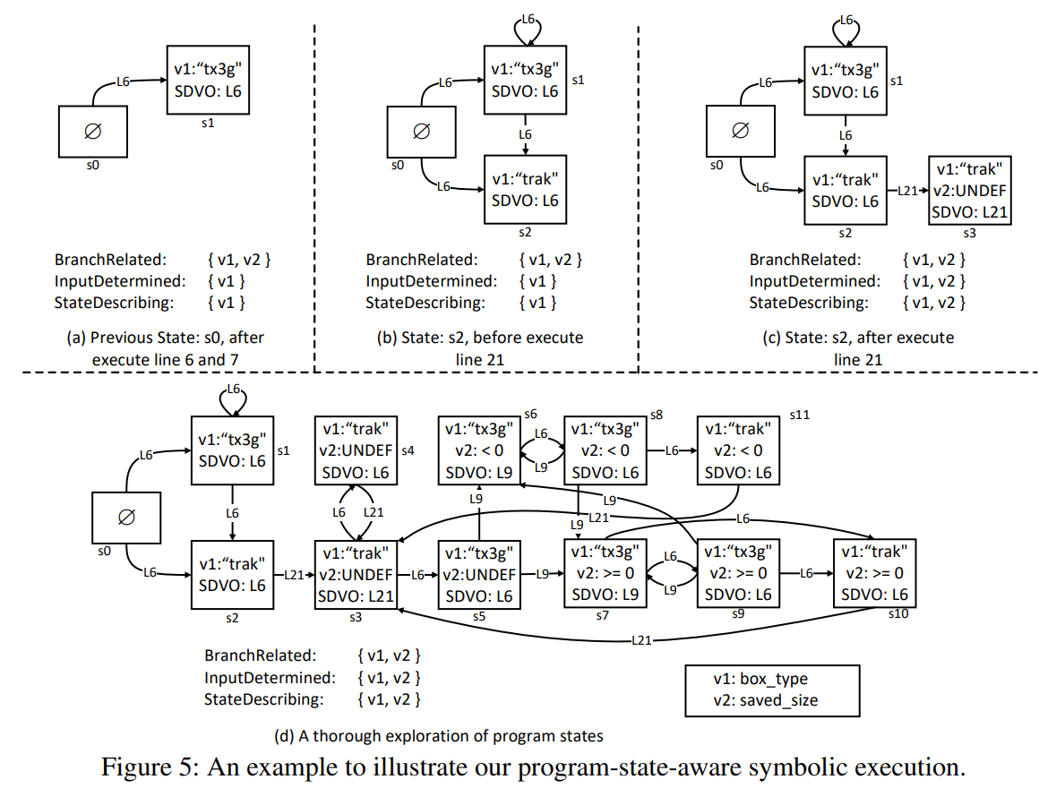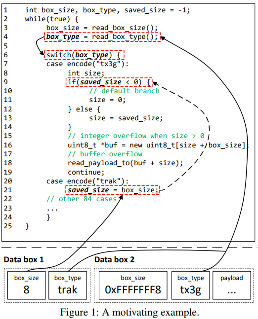 box_size와 box_type을 포함하며, 선택적으로 페이로드 데이터도 포함할 수 있다. 프로그램은 루프를 구현하고, 데이터 박스는 루프의 다른 반복에서 순차적으로 처리된다. 첫번째 "trak" 데이터 박스는 saved_size를 해당 박스의 크기로 설정하여 프로그램 상태를 변경한다(양수 값). "tx3g" 박스를 처리하는 다음 반복에서, 크기가 0보다 크므로(line 13이 선택됨), 공격자는 신중하게 저장된 box_size 값을 사용하여 취약점을 트리거할 수 있다.이렇게 상태에 민감한 프로그램 로직은 최신기술의 (암묵적인) 가정을 깨뜨린다.