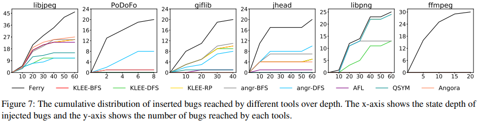 예를 들어, BFS 전략을 사용해서 libstagefright/ffmpeg/ImageMagick을 분석할 때, angr는 Ferry보다 6시간 동안 실행 경로를 10배 이상 분기한다.