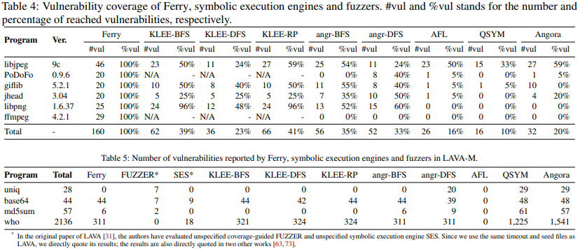 Ferry는 벤치마크 구축 기술을 공유하기 때문에, 삽입된 모든 취약점을 찾을 수 있다는 것이 놀라운 사실은 아니다. 우리는 River에서 QSYM의 성능이 좋지 않다는 것을 발견해서, 수동 분석 결과, QSYM은 반복되는 기본 블록을 감지하고, 심볼릭 실행에서 제외시키려고 시도한다는 특정 최적화 때문에, 이러한 문제가 발생했다. 이로 인해, QSYM은 입력 처리 루프의 많은 분기를 무시하게 된다. 평가된 도구 중에서 KLEE가 가장 많은 취약점을 찾아내며(41%), 심볼릭 실행기는 탐색 기법(특히, BFS)과 제약 해결 능력 덕분에 퍼저보다 더 얕은 취약점을 찾는 데 도움이 됐다.