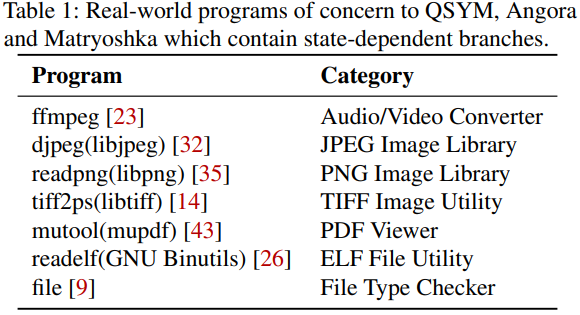 더 중요한 것은 이러한 프로그램들 중 많은 것들이 대규모 프로젝트와 시스템의 구성 요소이다. 예를 들어, Chromiun 프로젝트는 libpng와 libtiff를 포함한 state-dependent 분기문을 가진 여러 라이브러리로 구동된다. 우리는 이들의 특성(characteristics)을 다음과 같이 결론 짓는다.