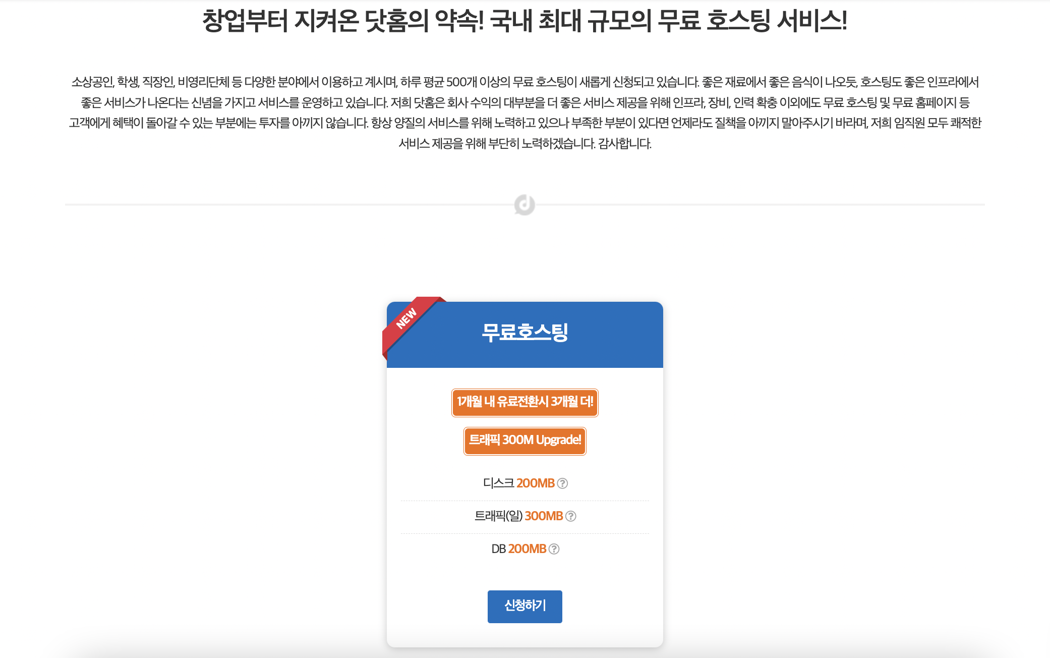 신청하기 버튼을 클릭하면 무료로 웹 호스팅을 진행할 수 있다.